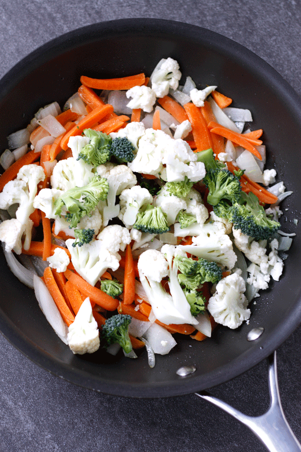 - Add remaining vegetables along with 1/4 cup water. Cover and continute to heat on medium for 5 minutes.